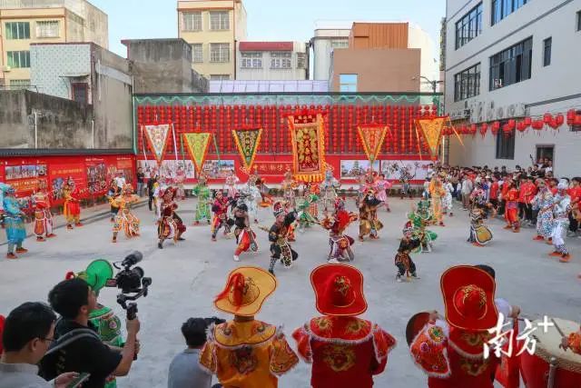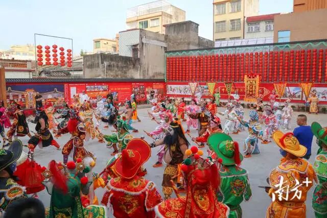 在汕头潮阳区铜盂镇新建成的中国潮阳英歌博物馆前,随着律动感十足的哨声和铿锵激昂的锣鼓声,身着彩衣、手持英歌槌的深坽村李族英歌队阵形齐整,槌法以中快板为主,步伐刚毅有力,每一个转身和跳跃都精准地踩中鼓点,呐喊声震天,充满力量感与艺术性。