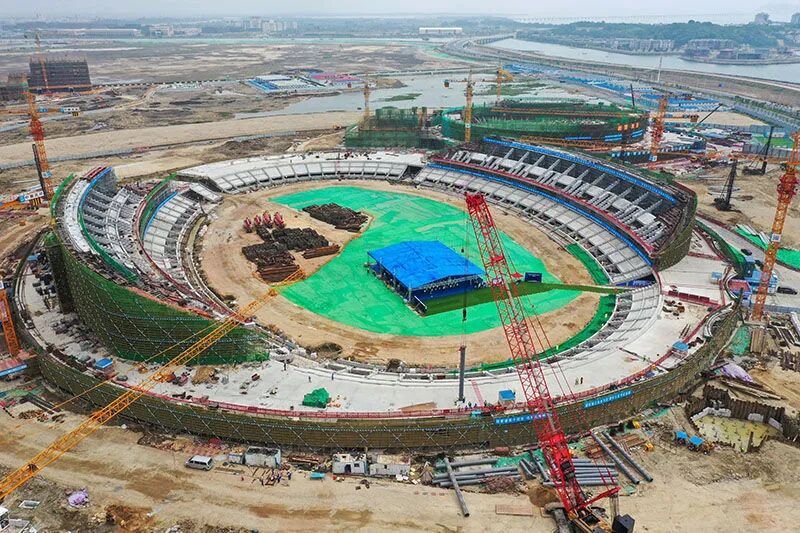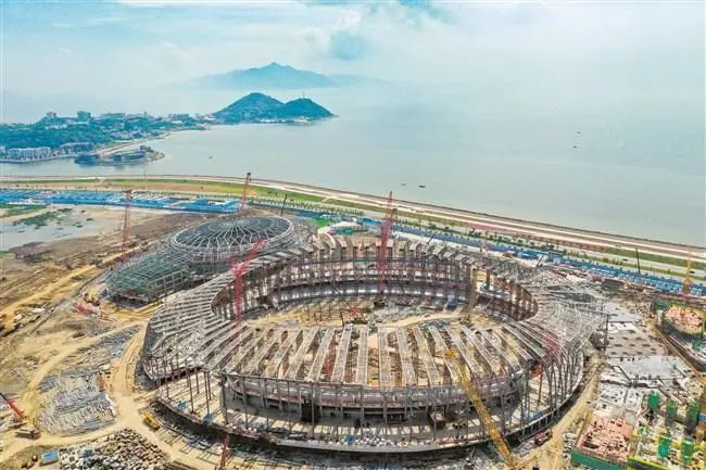▲8月30日,2021年亚青会主场馆项目钢结构主体全面封顶。