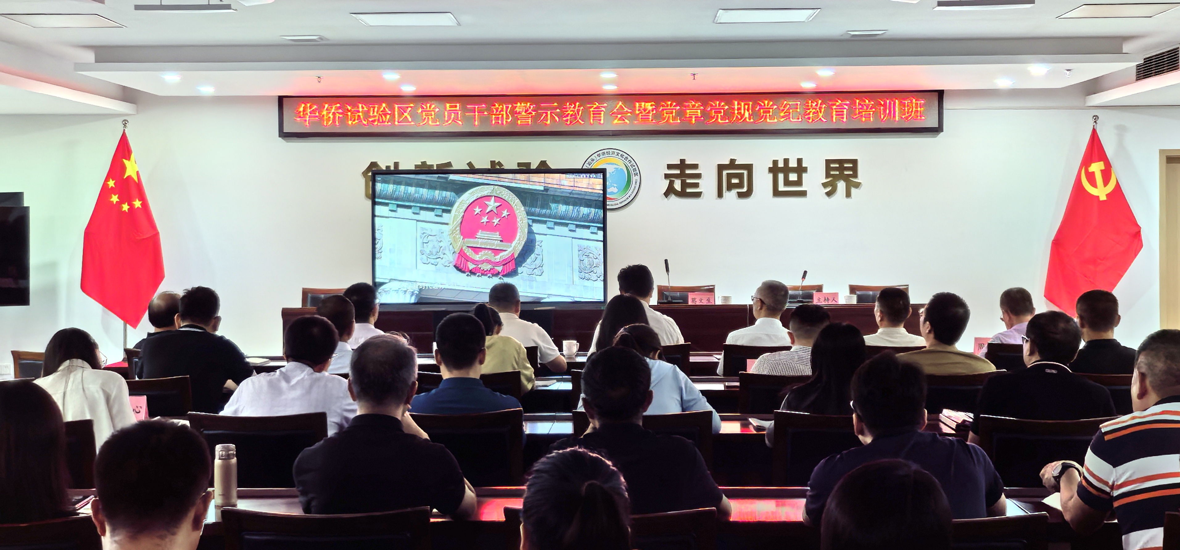 7月25日,华侨试验区召开党员干部警示教育会暨党章党规党纪教育培训班,集中观看有关警示教育片,结合违纪违法典型案例,深入学习领会习近平总书记关于全面加强党的纪律建设的重要论述精神,认真学习新修订的《中国共产党纪律处分条例》,扎实推进党纪学习教育走深走实,教育引导党员干部自觉用党规党纪校正思想和行动,确实做到知敬畏、存戒惧、守底线,推动全面从严治党向纵深发展。受党工委书记、管委会主任林楚雄委托,党工委委员、管委会副主任曹安定主持会议,党工委委员、纪工委书记葛文生作专题辅导党课。试验区党工委在家班子成员,管委会和直属各单位全体党员参会学习。