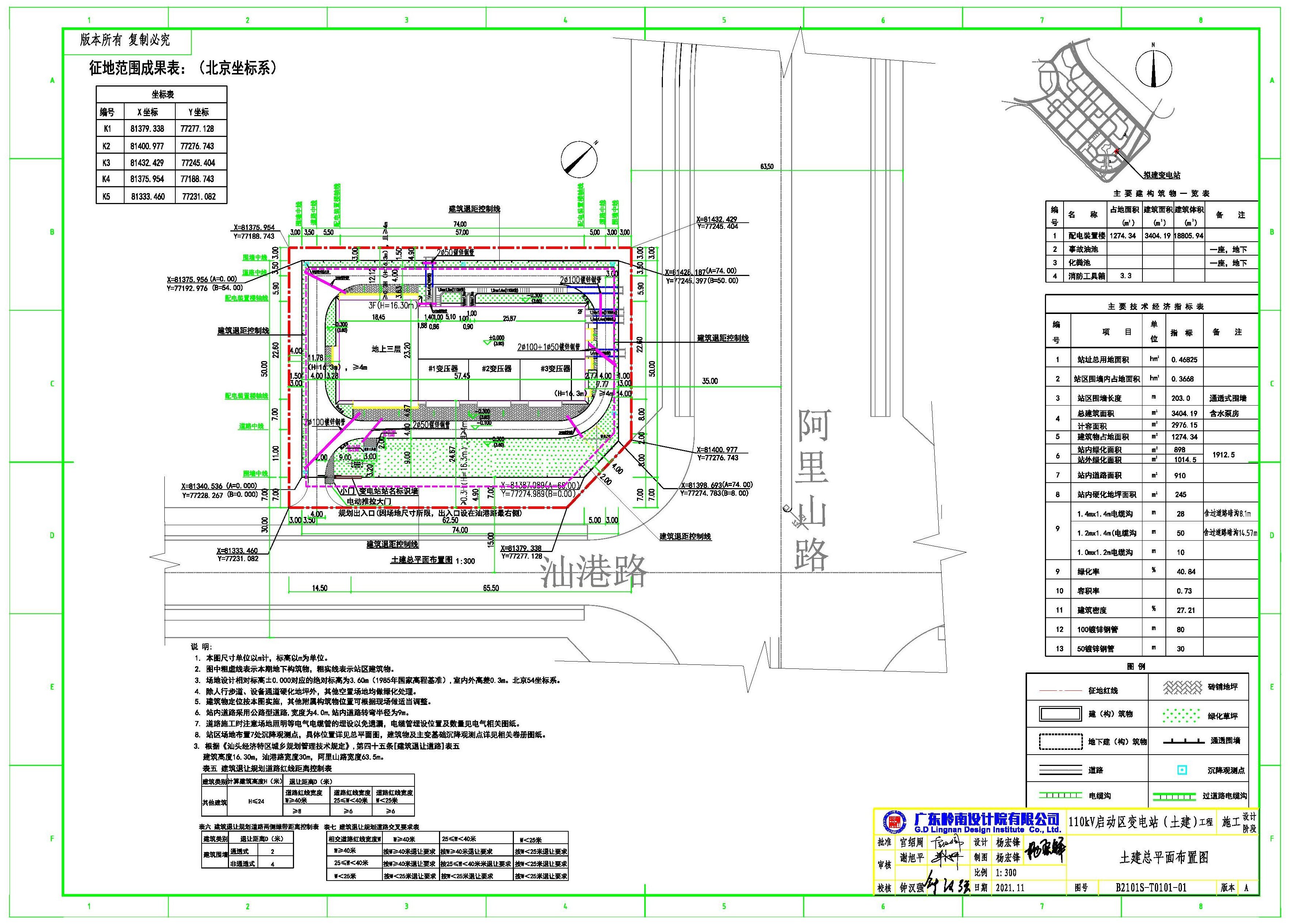 总建筑面积3404.19㎡,地上面积2976.15㎡,地下面积428.04㎡,配电装置楼1栋3层、消防小室等,地下配套事故油池、化粪池等。通透式围墙203.0m。