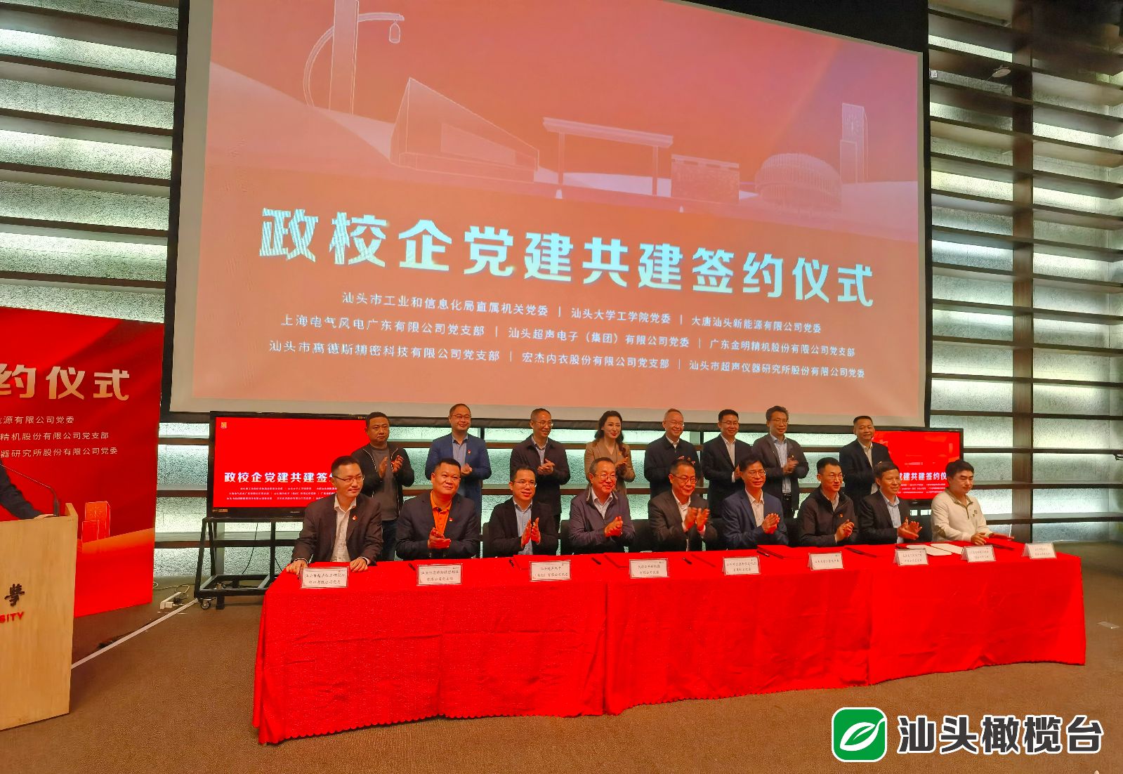 仪式上,汕头大学工学院党委和市工业和信息化局直属机关党委分别与大唐汕头新能源有限公司、上海电气风电广东有限公司、汕头超声电子(集团)有限公司、广东金明精机股份有限公司、汕头市高德斯精密科技有限公司、汕头市超声仪器研究所股份有限公司、宏杰内衣股份有限公司等单位党组织签约。