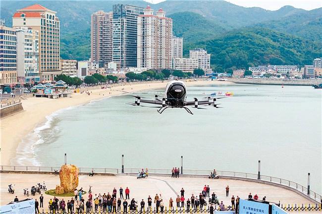 (亿航EH216-S无人驾驶航天器在南澳县祥云广场缓缓升空。 记者柯晓、陈史 摄)