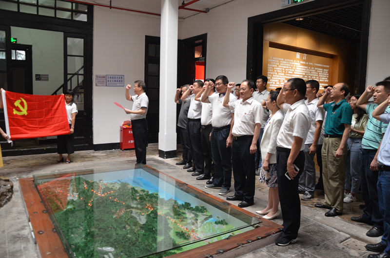 来到东征军革命史迹陈列馆后,在东征军群体雕像前,林毅荣带领全体党员干部面向鲜红的党旗,举起右拳,重温入党誓词。随后参观和聆听解说员讲解革命故事,学习革命精神,重温了八一南昌起义军南下部队在周恩来、朱德、贺龙、叶挺的率领下挺进广东,解放汕头的壮烈场面,从当年革命斗争的光辉历史和革命烈士抛头颅洒热血的英勇事迹中感悟初心使命、汲取前行力量。
