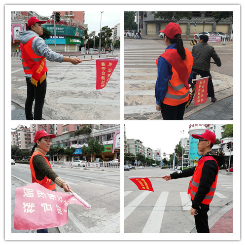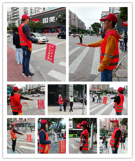 每一场活动,志愿者们都会提前到达,然后统一佩戴红色志愿帽、橙色马甲和红色文明绶带,手执交通小红旗,笔直地站在斑马线边上,协助民警疏导路口交通、劝导行人遵守交通规则,指引来往车辆文明出行。