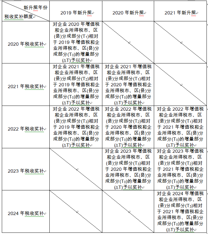 条款内容:从新升规后第一年起,参照企业缴纳增值税和企业所得税市、区(县)分成增量额度,连续三年分别由市、区(县)予以奖补。上述增量额度以企业缴纳增值税和企业所得税市、区(县)分成相对于基期(新升规当年)增加的部分为依据。