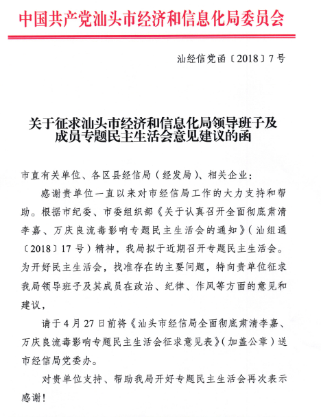 关于征求汕头市经济和信息化局领导班子及成员专题民主生活会意见建议的函