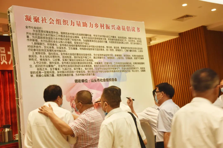 2022年8月25日,汕头市民政局结合汕头市社会组织总会召开会员大会时机,组织召开动员引领社会组织积极助力乡村振兴工作会议,部署社会组织参与乡村振兴工作。汕头市副市长赵志涛出席会议并讲话,市政协副主席陈严出席会议,汕头市民政局局长罗舜煜作动员部署,汕头市社会组织代表宣读了助力乡村振兴倡议书。会议由汕头市民政局副局长刘勤裕主持。汕头市社会组织总会130多家社会组织会员主要负责人参加会议。