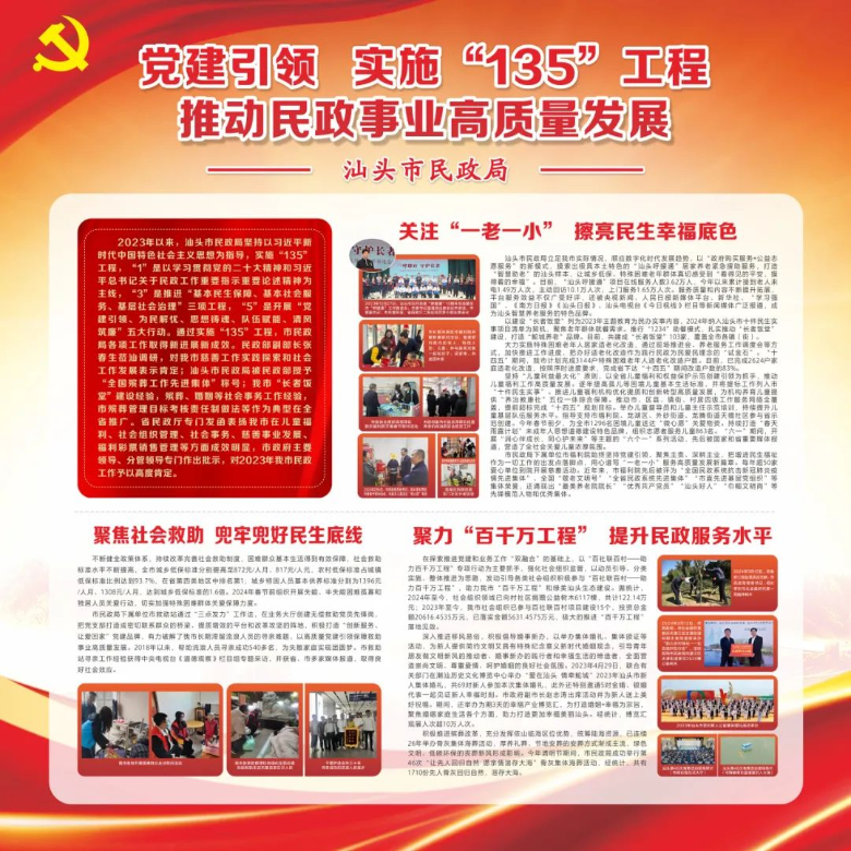 为庆祝中国共产党成立103周年,市民政局机关党委组织开展“弘扬伟大建党精神 感恩奋进新征程”庆祝中国共产党成立103周年主题活动。活动中,通过开展专题学习、党建成果展示、重温入党誓词、慰问老党员、颁发“光荣在党50年”纪念章等环节,弘扬党的光辉历程和伟大成就,激发党员干部职工爱党爱国热情。 牢记嘱托学思想,感恩奋进铸忠诚 各党组织巩固拓展学习贯彻习近平新时代中国特色社会主义思想主题教育成果,扎实开展党纪学习教育,学习贯彻习近平总书记“7·9”重要讲话精神,采取“集中学习+研讨交流+个人自学”学习模式,举行局党组理论学习中心组专题学习(扩大)会议、读书班、辅导报告、知识竞赛等活动,教育引导党员干部深刻领悟“两个确立”的决定性意义,坚决做到“两个维护”,始终做习近平新时代中国特色社会主义思想的坚定信仰者和忠实实践者。 创先争优勇担当,乘势而上谋发展 在中国共产党成立103周年来临之际,汕头市民政局直属机关党委被市委评为“汕头市先进基层党组织”,汕头市民政局社管社救党支部被市直机关工委评为“汕头市直先进基层党组织”,汕头市福利院杜炫同志被市直机关工委评为“汕头市直优秀共产党员”。这些荣誉激励了市民政局各级党组织和党员干部学习先进、崇尚先进、争当先进,为推进中国式现代化的汕头实践贡献民政力量。 “民政党建工作成果展示”活动 以“汕头市机关党建成果展示交流活动”为契机,收集我局近年来通过党建引领取得的工作成效,讲好民政故事。特别在“汕头呼援通”、绿色殡葬、救助寻亲、关爱困难群体、社会组织助力“百千万工程”建设、慈善帮扶等民政领域中总结经验成绩,以图片文字的形式在小公园开埠区党群服务中心进行展示宣传。 “我是党员我宣誓”重温党的光辉历程 局机关党委组织各党支部到红色教育基地开展“我是党员我宣誓”活动,各党支部结合实际通过采取举行党员重温入党誓词、讲红色故事等形式,教育引导党员干部回顾和感悟党的奋斗历程和光辉业绩,继承和发扬党的光荣传统,以实际行动彰显党员力量、擦亮先锋本色。 组织开展党内关爱帮扶和颁发“光荣在党50年”纪念章 落实落细关爱老党员工作,建立关爱老党员工作台账,组织对老党员和优秀党员进行走访慰问,传递党和政府的亲切关怀,切实增强党员的荣誉感、归属感、使命感。同时,扎实做好符合条件党员的全面摸查、核实表现、征求意见、公示公告、集体讨论、申报申领等工作,7月1日前,组织做好“光荣在党50年”纪念章的颁发,确保党员深切感受到以习近平同志为核心的党中央的关怀和温暖。