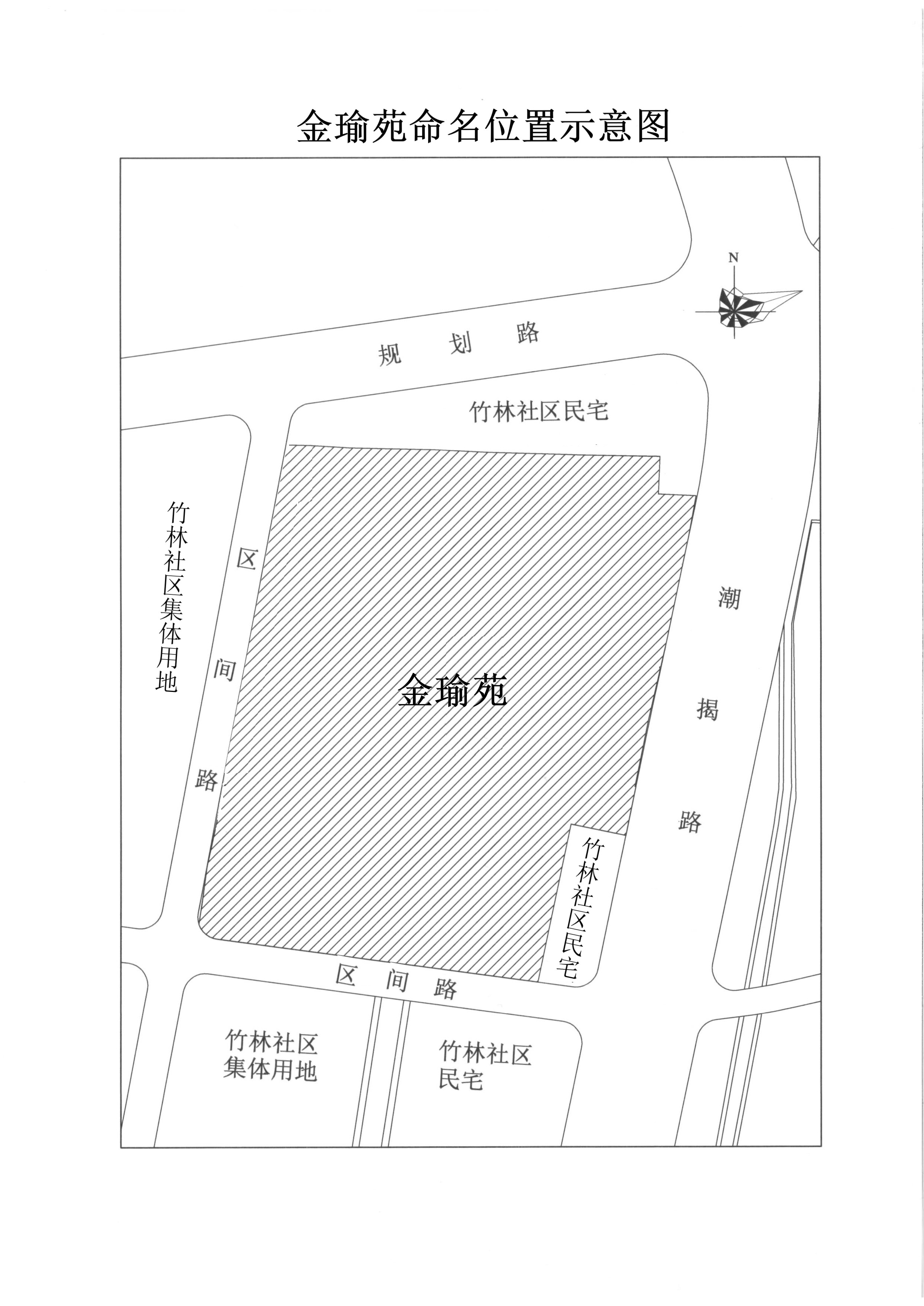 位于潮阳区西胪镇潮揭路西侧,由你单位开发建设的商住小区,根据地名管理有关规定,经实地踏勘,同意命名为“金瑜苑”。现批复如下: