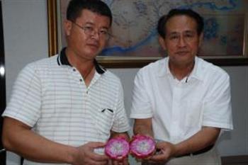 (记者 王荣岸屏东 报导)高树农民傅柏琮历经10年的研究,成功栽植出有双色果肉的红龙果,切开果实后,果肉呈内白、外粉红的均匀色泽,与一般只有单一果肉色的红龙果有所不同,相当特别,县长曹启鸿对其努力研究的精神给予肯定。