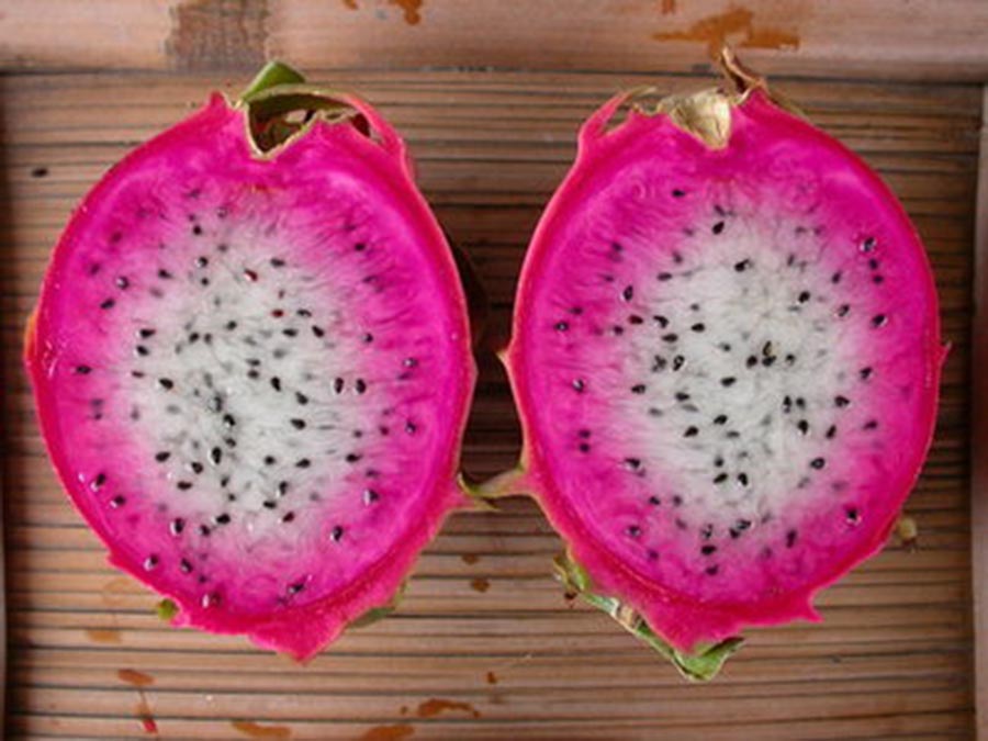 在高树经营4公顷五郎农场的农民傅柏琮表示,红龙果依果肉色来分,市面上常见的是白色与紫红色,果肉色是呈现单一的颜色,经过多年的研究栽培,已经栽种出双色果肉的红龙果,果肉呈现内白外粉红的均匀色泽,与一般的白肉或红肉红龙果有所不同。傅柏琮说,栽培双色果肉红龙果的技术门坎很高,是历经了10年的研究才栽培出来。