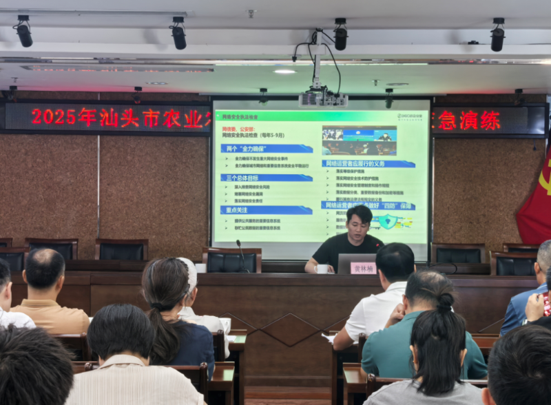 为更好贯彻落实习近平总书记关于网络强国的重要思想,进一步提升全体干部职工的网络安全防护能力,提高网络安全意识,增强网络安全事件应急处置能力,2025年7月4日,汕头市农业农村局开展2025年网络安全培训及应急演练。