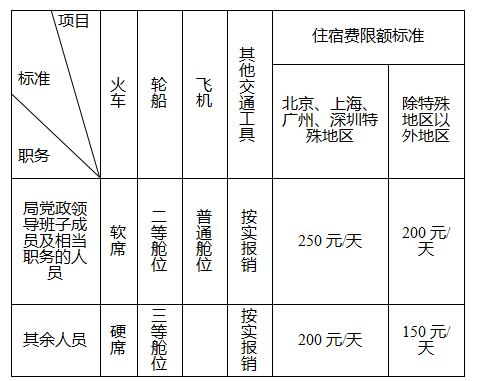 (二)上表列其他交通工具不包括出租小汽车,出差到市外地区可报销住宿地至车站、码头、机场往返两程出租小汽车费。出差外地及汕头市区内办事,原则上不得乘坐出租小汽车,因特殊情况确需乘坐的,须说明原因、时间及注明起始地点,报局分管财务副局长审批。
