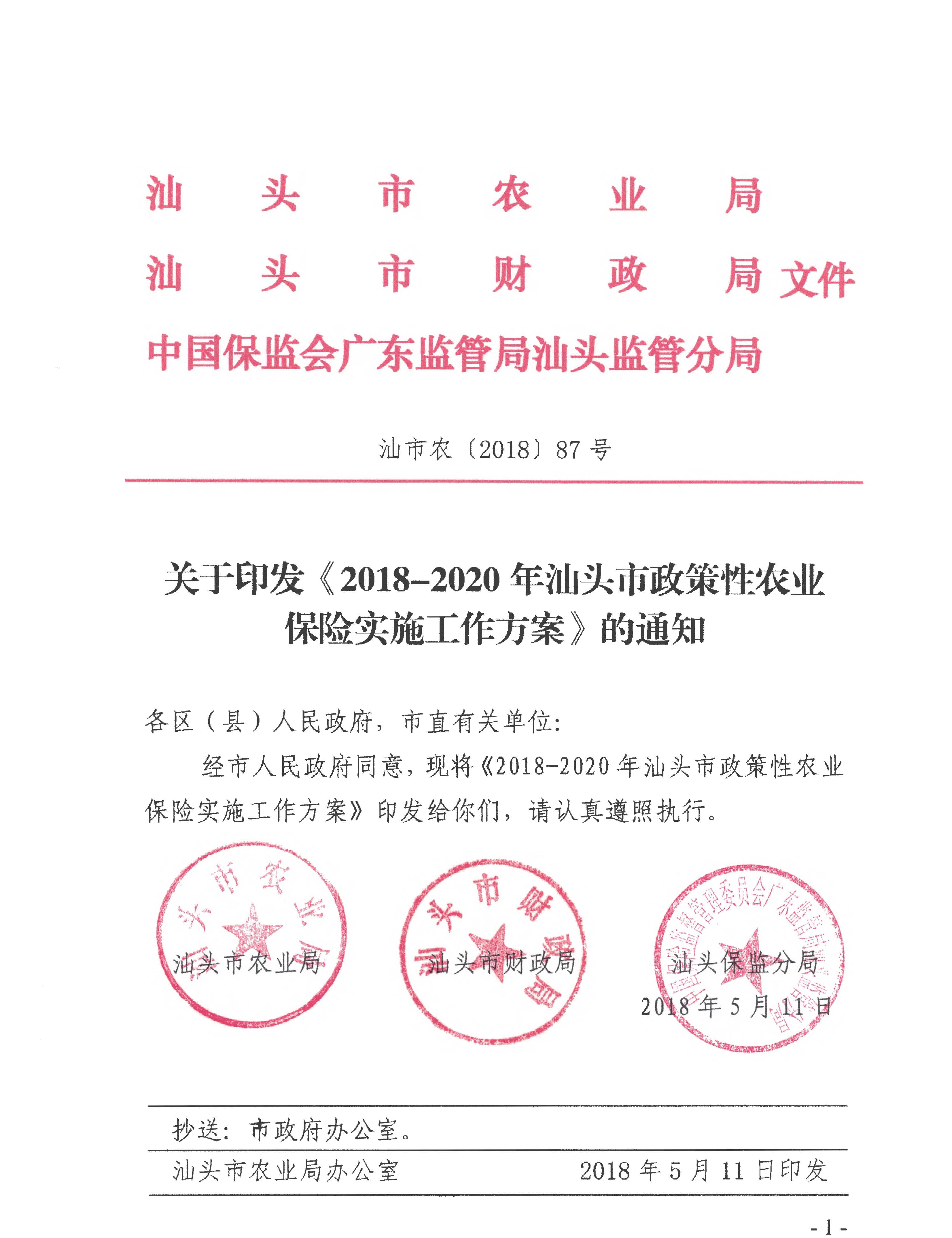 关于印发《2018-2020年汕头市政策性农业保险实施工作方案》的通知