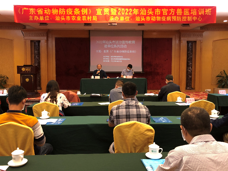 为深入贯彻《广东省动物防疫条例》,切实提升官方兽医依法履职能力和水平,由市农业农村局主办,市动物疫病预防控制中心承办的《广东省动物防疫条例》宣贯暨2022年汕头市官方兽医培训班,于5月17-18日在龙湖宾馆会议中心举行。来自市、区县二级动物卫生监督机构、疫控机构的在职在岗官方兽医48人参加本次培训。