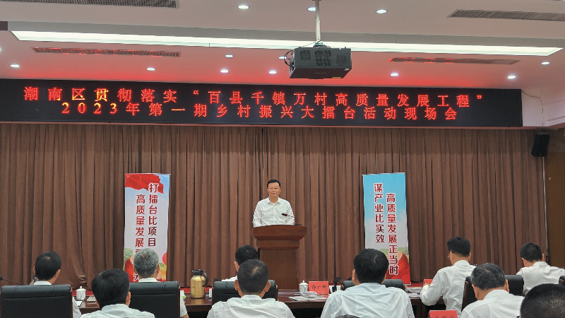 为提升我区乡村产业发展水平,奋力推动潮南区在新起点上开启高质量发展新征程,4月19日上午,潮南区贯彻落实“百县千镇万村高质量发展工程”——2023年第一期乡村振兴大擂台活动现场会在区党政办公用房会议中心第三会议室举行。活动以“共谋产业促振兴,提质增效利百姓”为主题,通过“同台比武竞技”的形式,进一步压实五级书记抓乡村振兴责任使命,激发各镇(街道)竞争动力、发展潜力,推动各镇(街道)积极谋划乡村振兴产业项目,促进形成担当作为、竞相发展、开拓创新的乡村振兴新局面,加快推动潮南乡村高质量发展。此次活动邀请了区委书记许广圻、区长张晓铿、区人大常委会主任陈锐勇、区政协主席孙健文、区委副书记陈邦棉、区委常委杨晓、区委常委、副区长曹晓卫,市农业农村局四级调研员陈云鹏等领导同志参加。