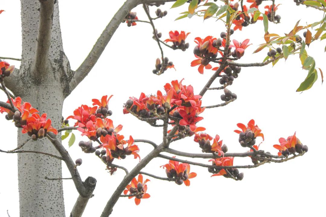 “参天古干争盘拿,花时无叶何纷葩!白缀枝枝蝴蝶茧,红烧朵朵芙蓉砂。”短短几句,便足以描述其花期繁盛时的惊艳。木棉全盛时,满树枝干缀满艳而硕大的花朵,如火如荼,耀眼醒目,极为壮丽,木棉花树又素有“英雄树”的美名。