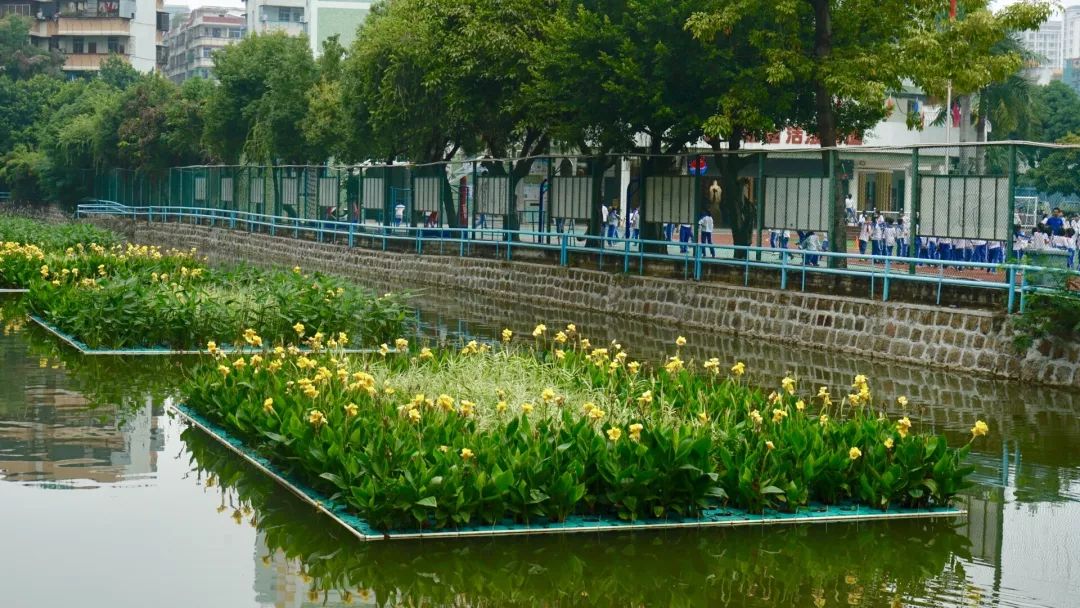 您看,那一张张漂浮于河道内,上面长满美人蕉、再力花、黄鸢尾、花叶芦竹等绿色水生植物的绿色“甲板”,就是生态膜床。生态膜床上的绿色水生植物不仅给周边增添了绿意盎然的景观,为沟体景观“景”上添花,通过投放土著微生物,它还能与浮床下面的生物填料形成一个微生物处理环境,使水体的污染物、河床原污染底泥释放的污染物得到分解,有效削减富氧化水体中的氮、有机磷等污染物质,从而达到生态净化水质的效果。