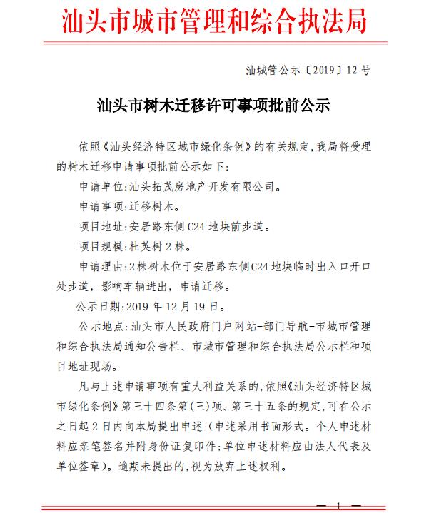 汕头市树木迁移许可事项批前公示(汕城管公示【2019】12号)