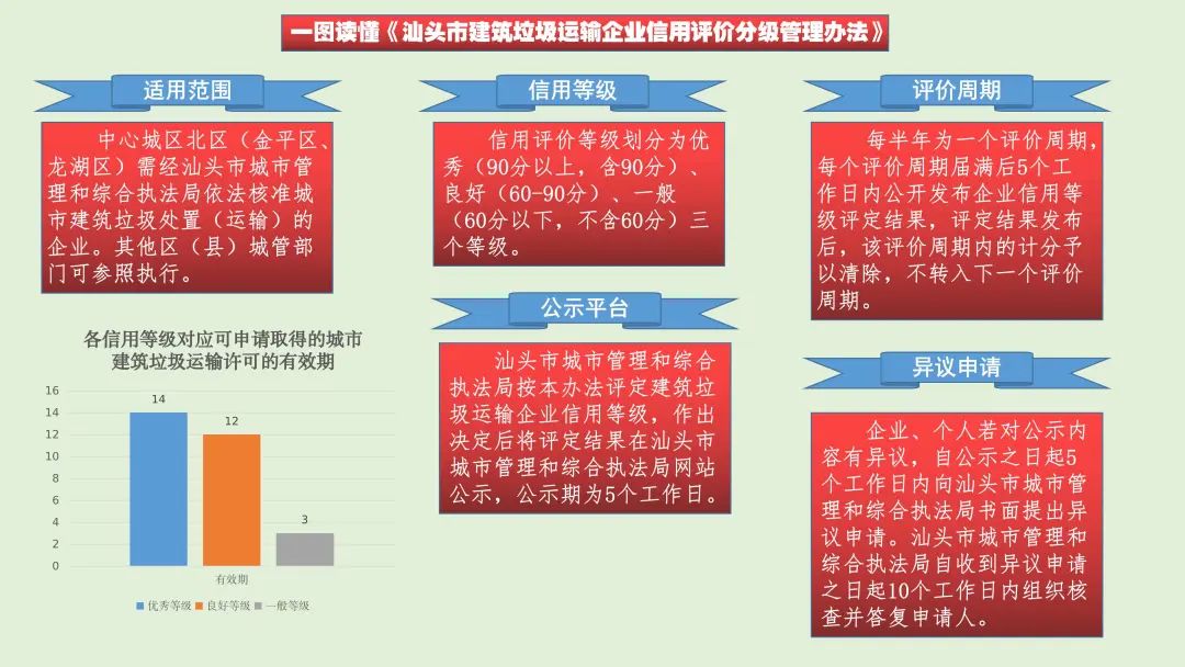 为进一步规范我市建筑垃圾运输企业的合法经营行为,加强建筑垃圾运输企业的监管,推进建筑垃圾运输企业信用体系建设,市城管局研究制订《汕头市建筑垃圾运输企业信用评价分级管理办法》,经市司法局法律审查同意后正式印发并向社会公布,于2024年1月1日起施行,有效期5年。