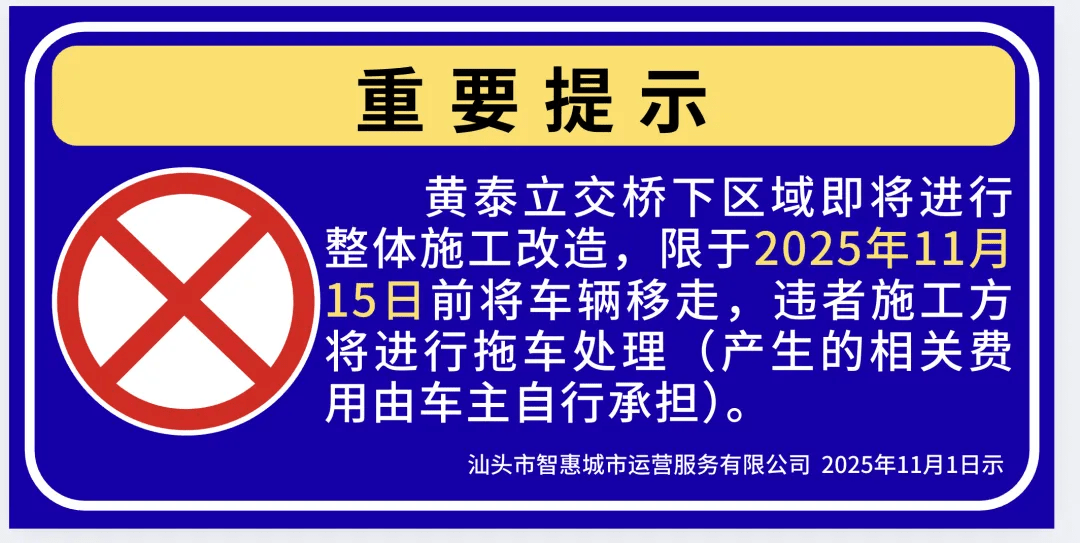 请已停放于本施工区域内的车辆车主,务必于2025年11月15日前将您的爱车移离。您的及时配合,是项目改造建设顺利推进的关键!