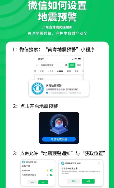 提前设置好地震预警防患于未然,用户也可以按图操作打开“南粤地震预警”地震预警功能,方便、快捷接收官方、权威地震预警信息。