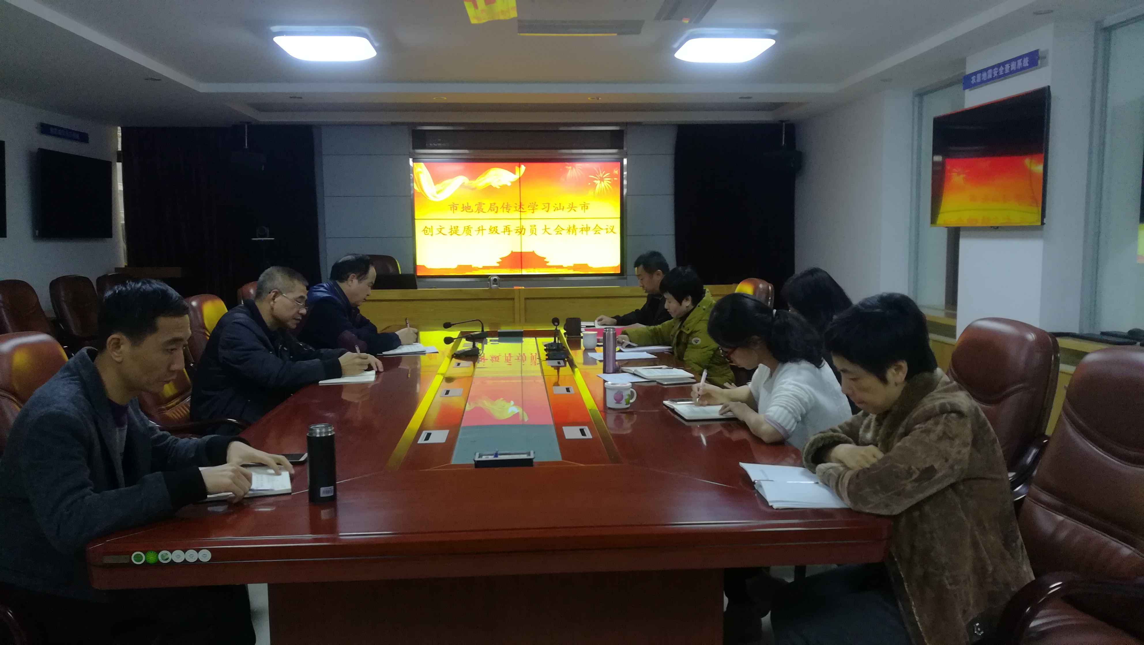 2月18日,市地震局召开全体干部会议,第一时间传达学习全市创文提质升级再动员大会精神,副局长、党组成员吴华强同志对全局新一年创文提质升级工作进行再动员再部署。
