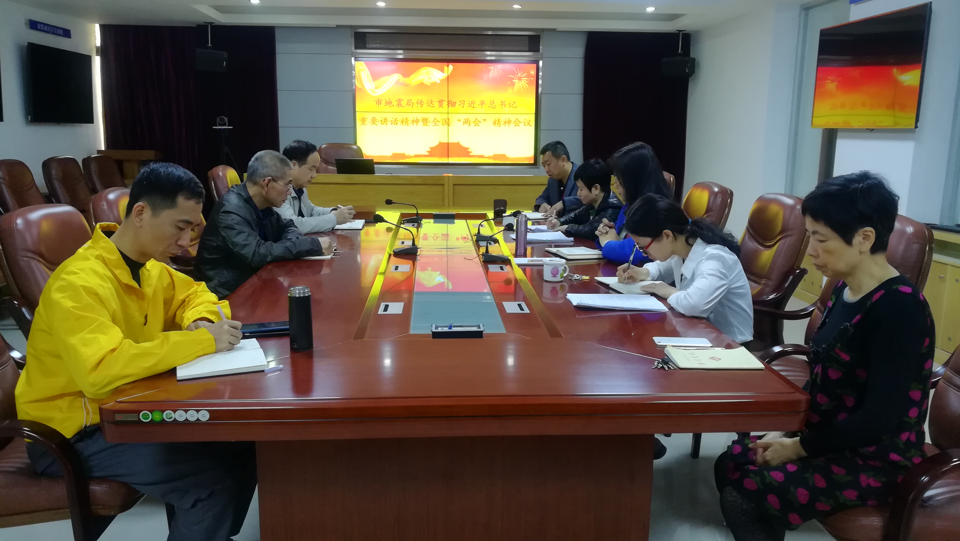 3月19日上午,市地震局召开全体干部大会,传达学习贯彻习近平总书记重要讲话精神暨全国两会精神,组织学习《政府工作报告》及《第十三届全国人民代表大会第二次会议决议决定》,研究提出贯彻落实意见。市地震局副局长吴华强同志主持会议。