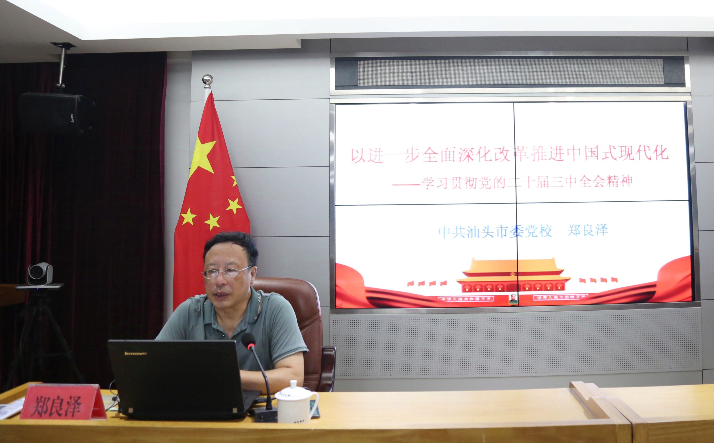 为深入学习贯彻党的二十届三中全会精神,推动全会精神在党员干部中入心入脑落地生根,8月13日上午,市地震局联合汕头地震监测中心站、有色金属地质局九三一地质队、省地质局第二地质大队举办深入学习贯彻党的二十届三中全会精神宣讲报告会。报告会邀请中共汕头市委党校经济学教研室主任、副教授郑良泽作专题宣讲报告,局党组书记、局长罗舜煜主持活动,各单位在职党员干部和市地震局退休党员参加。