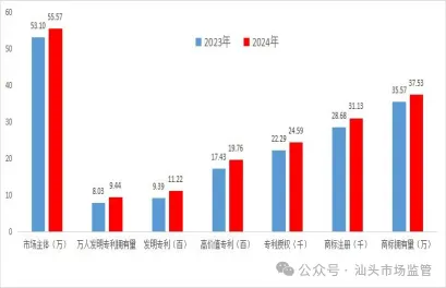 【知识产权强市建设试点工作系列宣传报道之一知识产权创造】近年来,汕头市市场监管局(知识产权局)以习近平新时代中国特色社会主义思想为指导,深入学习贯彻党的二十大精神,全面落实国家、省和市委市政府工作部署,多措并举,积极争取国家、省级和市级知识产权专项资金支持,通过大力培育示范优势企业,设立高价值专利培育布局中心和商标品牌培育指导站等项目建设,不断加强对企业知识产权创造的针对性指导和服务,支持创新主体围绕省、市重点培育发展的战略性支柱产业集群和战略性新兴产业集群,从产业中选取关键、核心领域技术点开展精准培育,促进高质量知识产权产出,加快创新驱动发展。截至2024年底,汕头全市市场主体达555666户,比增4.65%;拥有国家知识产权示范企业12家,国家知识产权优势企业26家,省知识产权示范企业18家。2024年全市新增专利授权24587件,比增10.31%,居全省第7位,其中新增发明专利1122件,比增19.49%。全市发明专利有效量5247件,其中高价值发明拥有量1976件,均居粤东西北第一位!每万人口发明专利拥有量9.44件,比增14.94%;有效发明专利十年以上维持率22.2%,居全省第3位。2024年新增注册商标31129件,比增8.53%,有效注册商标量375328件,居全省第5位;新增集体商标6件,全市拥有集体商标总量累计达76件,居全省第2位。