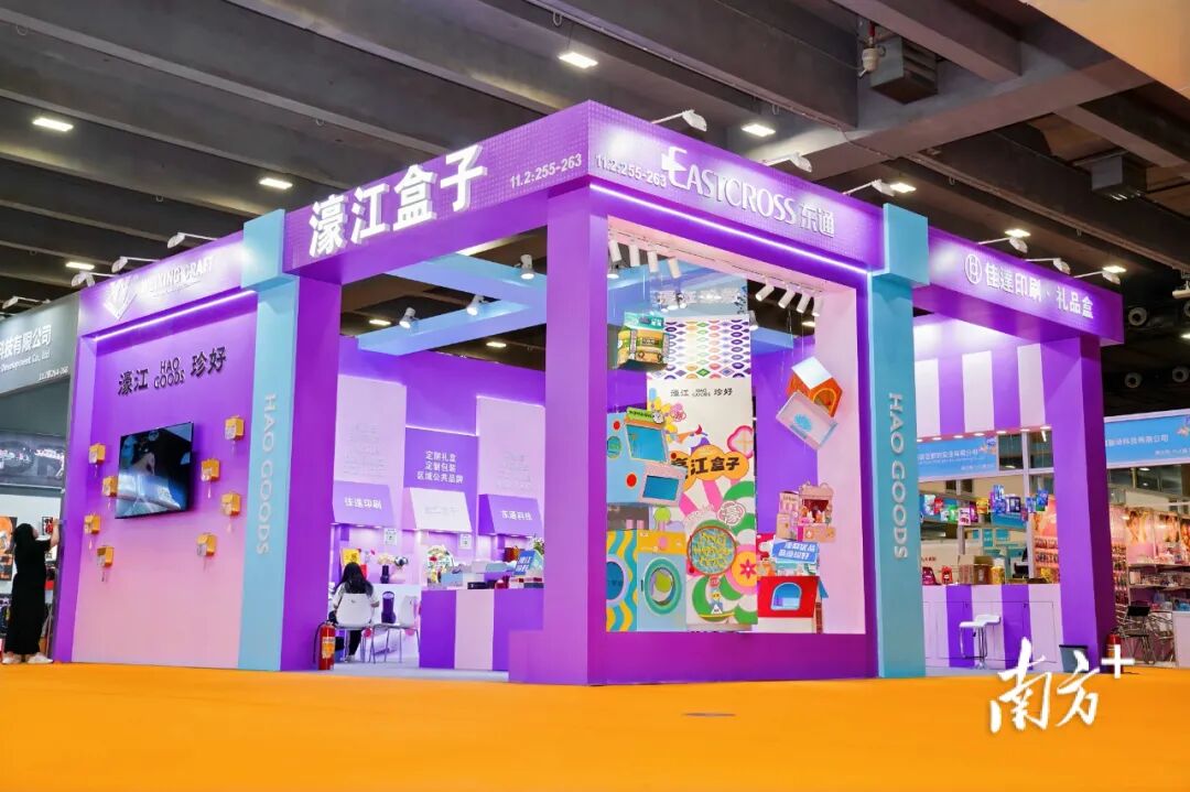9月12日至14日,首届广东优品展览会在广交会B区展馆举行。当客商步入玩具文创展区,一个巨型紫色盒子的特装陈设瞬间抓住所有人的目光。硕大的招牌上,“濠江盒子”四个大字格外醒目,展位四周悬挂着各式各样、形态万千的包装盒,令人一目了然:这定是与包装印刷相关联的企业展位。