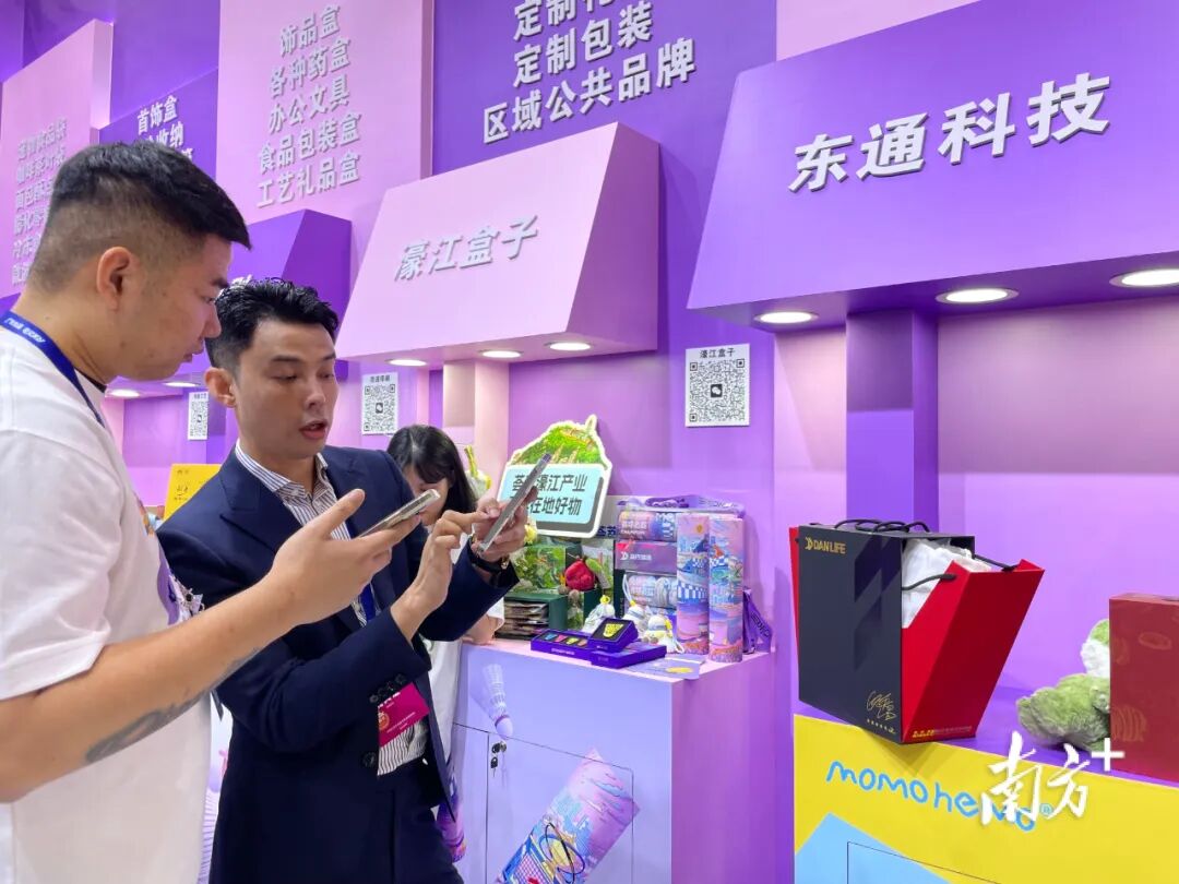 “这是我们濠江的包装产业,欢迎参观!”每当有客商踏入展位,“濠江盒子”中多位来自包装企业的“企二代”主理人便秒变热情的“店小二”,主动上前迎宾。记者留意到,他们在详尽介绍完自家产品后,会贴心地引导客商前往下一家企业的产品展示区,像传递交接棒一样,将介绍任务交给下一位主理人。如此一来,客商只需在“濠江盒子”展位逛上一圈,便能大致了解濠江包装产业的特色以及跨界创新的亮点所在。