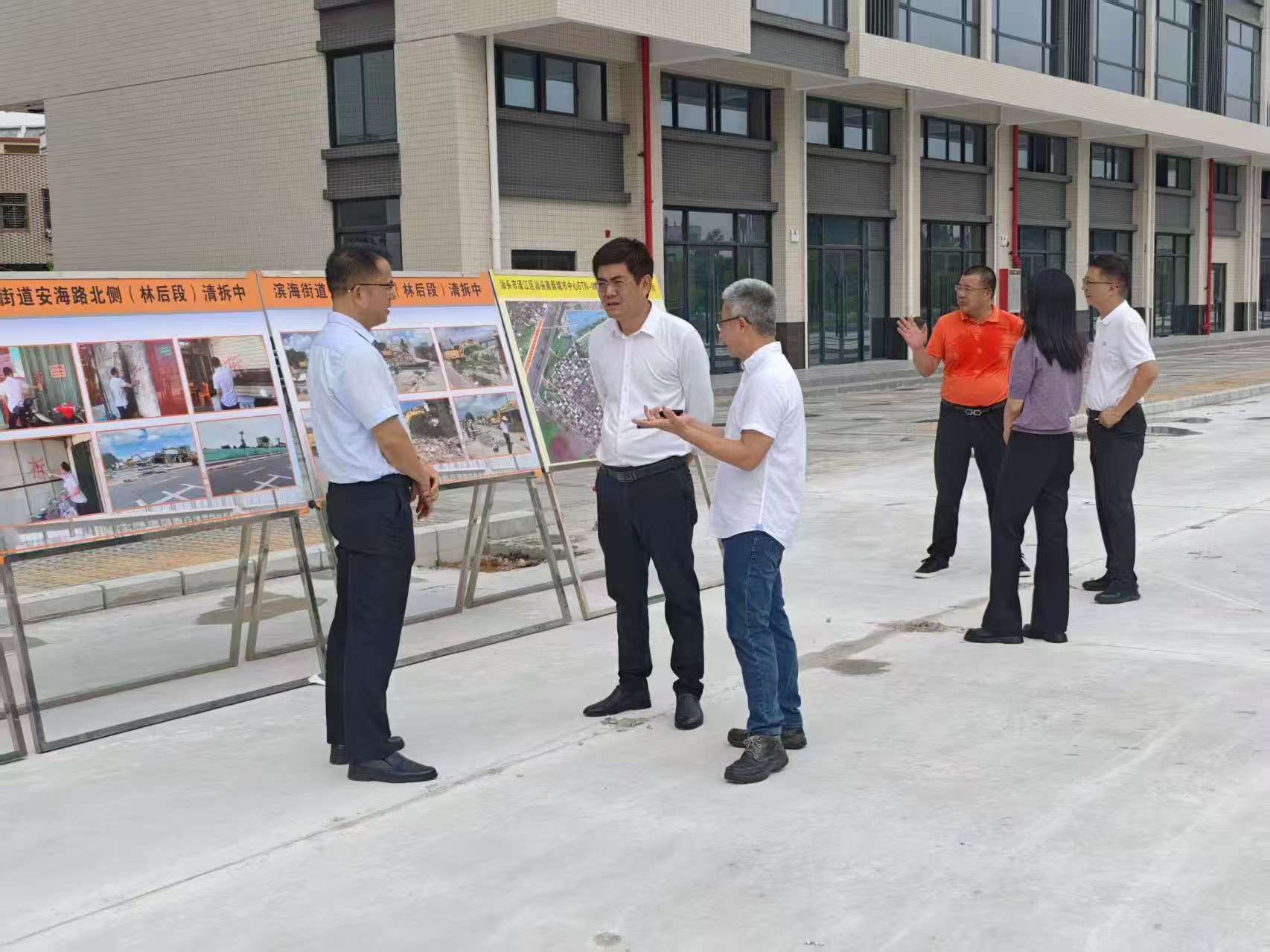慰问活动结束后,陈捷锋局长一行前往濠江区滨海街道开展“五联五促”助力“百千万工程”行动,对“百千万工程”重点项目“林后美食街”建设情况进行调研。在林后社区项目现场,调研组听取滨海街道主要负责同志关于贯彻落实“百千万工程”工作的情况汇报和介绍了美食街项目建设进展和后续开展招商、运营等情况。