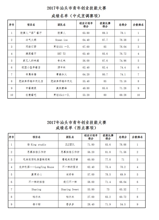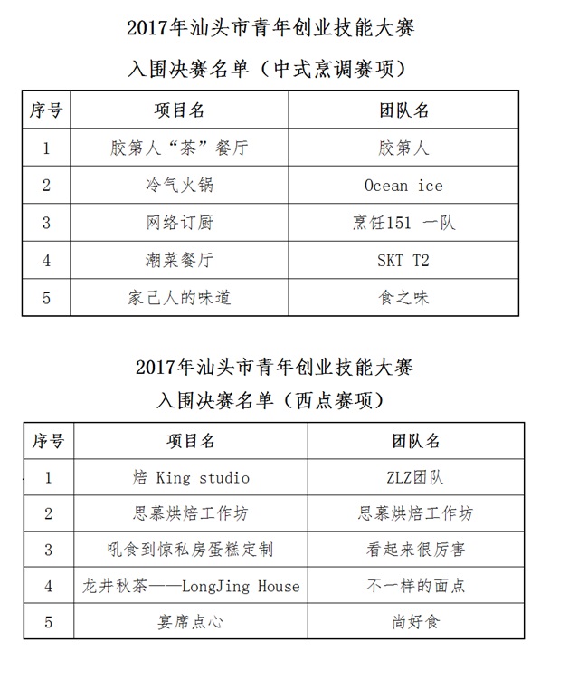 1、2017年汕头市青年创业技能大赛“中式烹调”项目组入围决赛名单