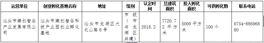 根据《广东省人力资源和社会保障厅 广东省财政厅关于进一步加强创业孵化基地建设的意见》(粤人社发〔2015〕166号)、市人社局 财政局《关于进一步做好创业孵化基地建设工作的通知》(汕人社〔2016〕172号)等有关规定,经市人力资源和社会保障局、市财政局审核批准,认定汕头市潮创智谷科技产业园创业孵化基地为市级创业孵化基地。有关情况如下: