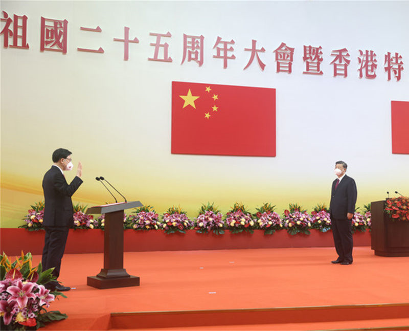 新华社香港7月1日电(记者陈键兴 朱基钗 赵博)庆祝香港回归祖国25周年大会暨香港特别行政区第六届政府就职典礼1日上午在香港会展中心隆重举行。中共中央总书记、国家主席、中央军委主席习近平出席并发表重要讲话。他强调,25年来,在祖国全力支持下,在香港特别行政区政府和社会各界共同努力下,“一国两制”实践在香港取得举世公认的成功。“一国两制”是经过实践反复检验了的,符合国家、民族根本利益,符合香港、澳门根本利益,得到14亿多祖国人民鼎力支持,得到香港、澳门居民一致拥护,也得到国际社会普遍赞同。这样的好制度,没有任何理由改变,必须长期坚持。
