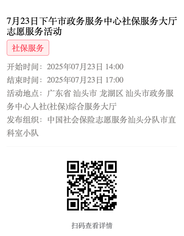 为充分保障我市社保志愿者权益,自2022年10月18日起,报名参加汕头市社保局和各分局志愿活动的同志须持有志愿者证并已激活,请各位志愿者遵照执行。