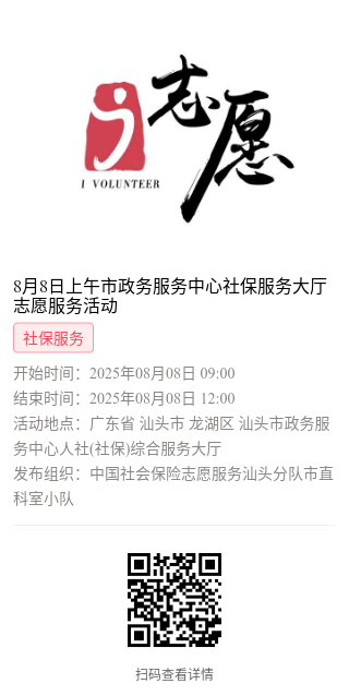 为充分保障我市社保志愿者权益,自2022年10月18日起,报名参加汕头市社保局和各分局志愿活动的同志须持有志愿者证并已激活,请各位志愿者遵照执行。