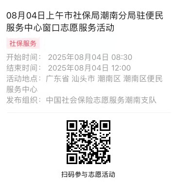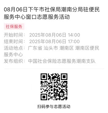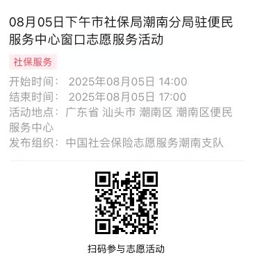 2025年08月04日至08月08日市社保局潮南分局驻便民服务中心窗口志愿服务活动,需要每一个可爱的你参与!