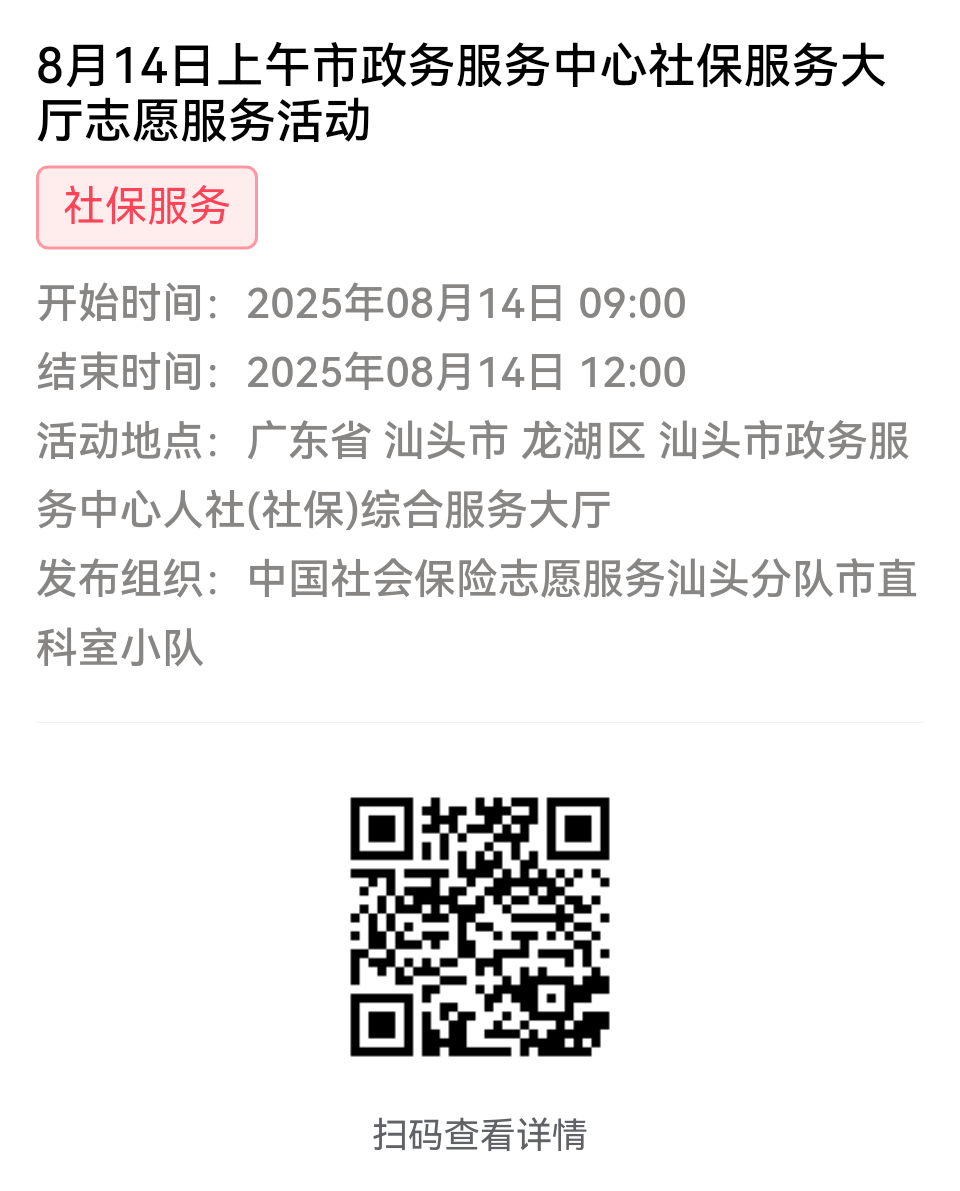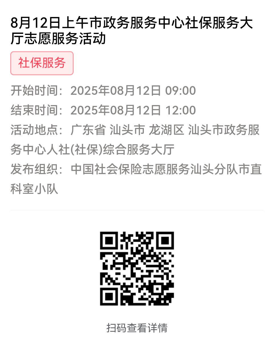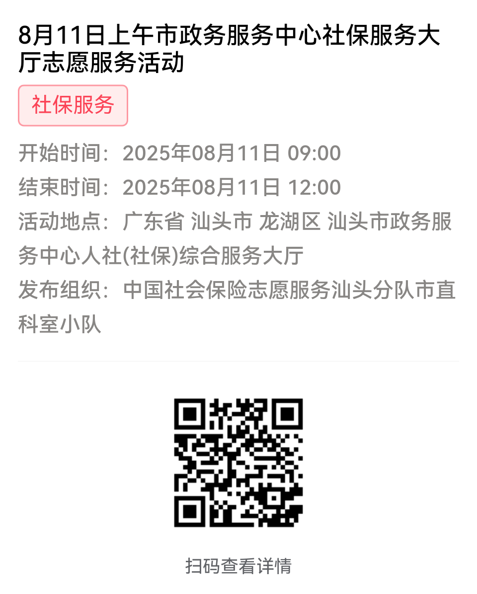 为充分保障我市社保志愿者权益,自2022年10月18日起,报名参加汕头市社保局和各分局志愿活动的同志须持有志愿者证并已激活,请各位志愿者遵照执行。