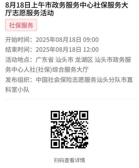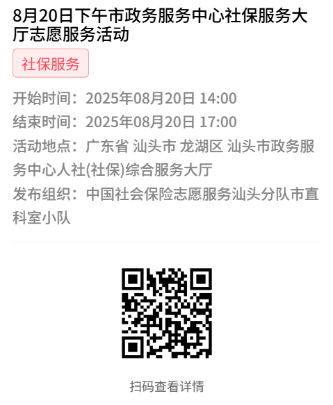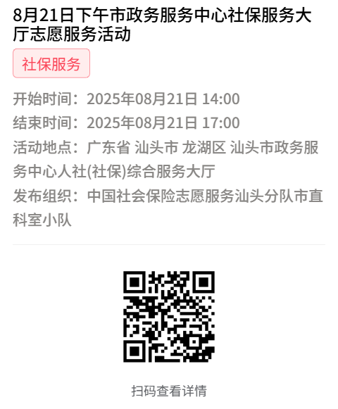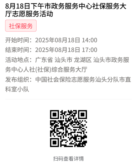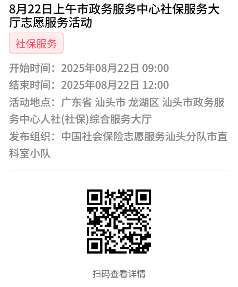 为充分保障我市社保志愿者权益,自2022年10月18日起,报名参加汕头市社保局和各分局志愿活动的同志须持有志愿者证并已激活,请各位志愿者遵照执行。