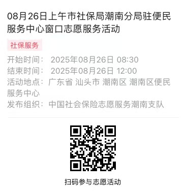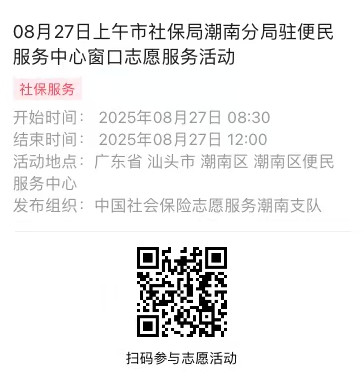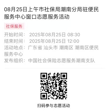 2025年08月25日至08月29日市社保局潮南分局驻便民服务中心窗口志愿服务活动,需要每一个可爱的你参与!