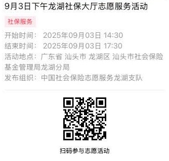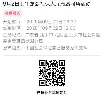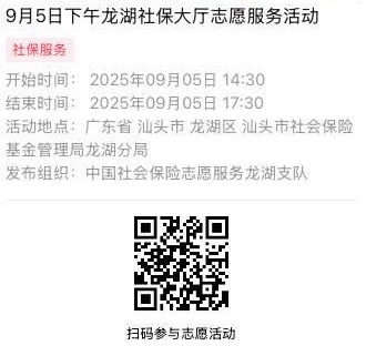2025年9月1日至2025年9月5日市社保局龙湖分局大厅志愿服务活动,需要每一个可爱的你参与!
