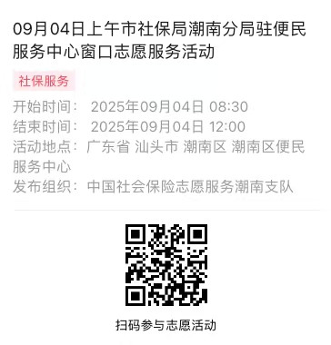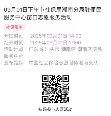 2025年09月01日至09月05日市社保局潮南分局驻便民服务中心窗口志愿服务活动,需要每一个可爱的你参与!
