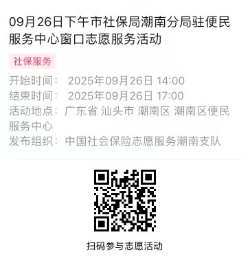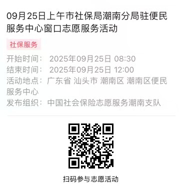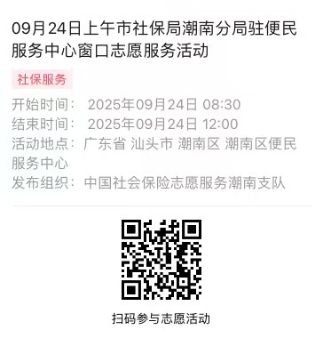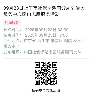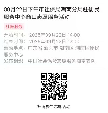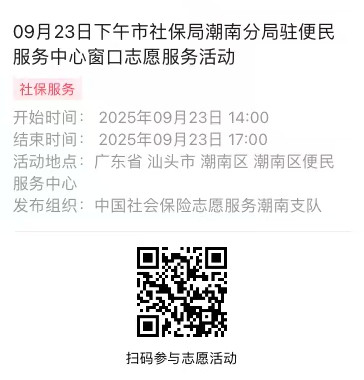 2025年09月22日至09月26日市社保局潮南分局驻便民服务中心窗口志愿服务活动,需要每一个可爱的你参与!