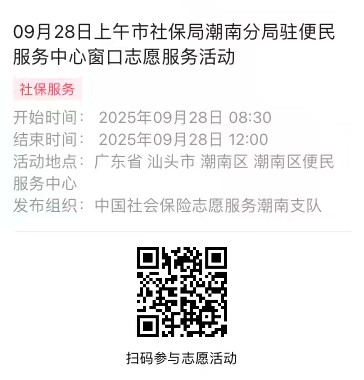 2025年09月28日至09月30日市社保局潮南分局驻便民服务中心窗口志愿服务活动,需要每一个可爱的你参与!
