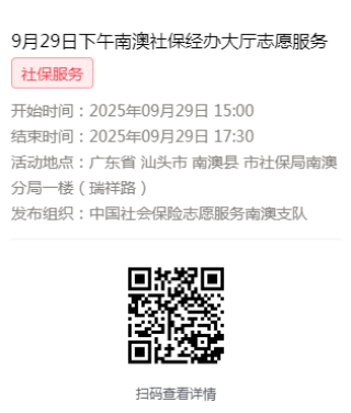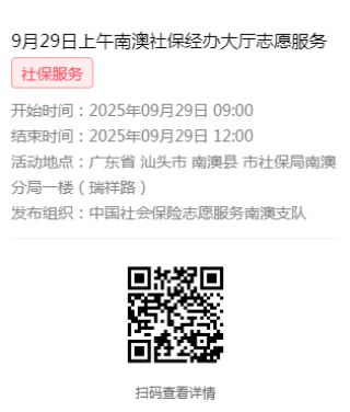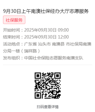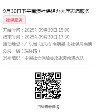 2025年9月28日至9月30日市社保局南澳分局大厅志愿服务活动,需要每一个可爱的你参与!