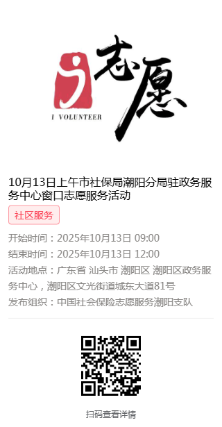2025年10月13日至10月17日市社保局潮阳分局驻政务服务中心窗口志愿服务活动,需要每一个可爱的你参与!