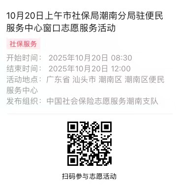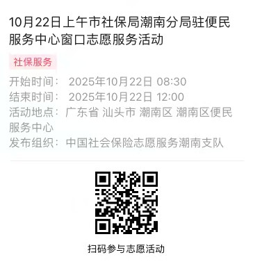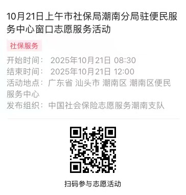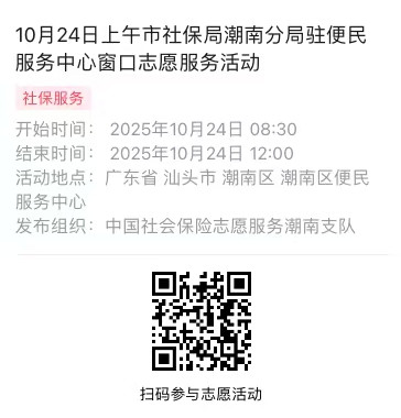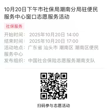 2025年10月20日至10月24日市社保局潮南分局驻便民服务中心窗口志愿服务活动,需要每一个可爱的你参与!