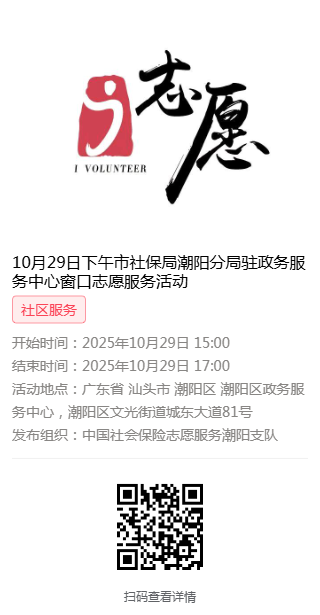 2025年10月27日至10月31日市社保局潮阳分局驻政务服务中心窗口志愿服务活动,需要每一个可爱的你参与!